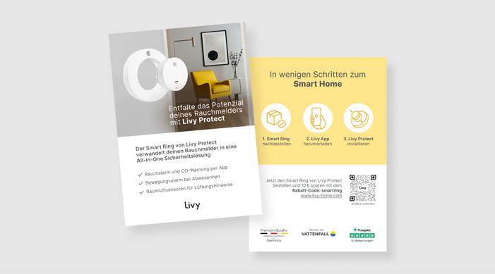 Livy Protect vereint Einbruchschutz und Rauchmelder in einem Gerät. Die klaren Formen der Designsprache greifen die Form des Gerätes und die einfache Anwendung auf. Durch knallige Farben soll weniger die Technik, als der Menschen als Nutzer*in im Mittelpunkt stehen.